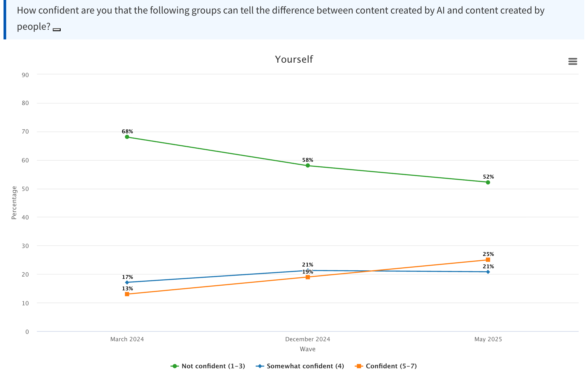 As shown in Figure 2, while exposure has grown, people’s confidence in spotting AI content has not collapsed in the way many would have feared, in fact the opposite seems to be the case: people have increasingly become more confident in their ability to detect AI-generated content. In 2024, a large majority of 68% said they were not confident in their ability to detect AI. By mid-2025, that figure dropped to 52%.