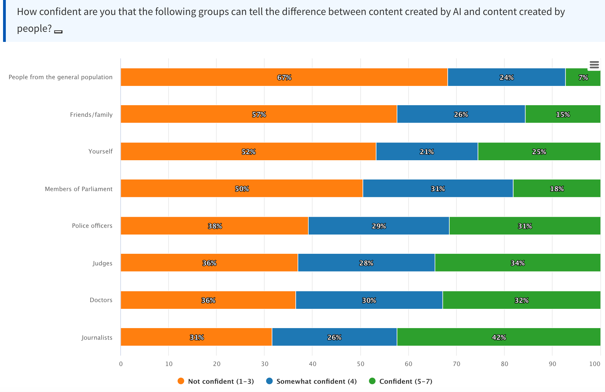 Still, skepticism about others’ ability remains widespread. Journalists are the most trusted group to recognize AI content, but even here, only 27% of respondents express confidence (Figure 3). Trust is lowest in the general public: 76% say they don’t trust ordinary people to detect AI—followed by friends and family (69%).