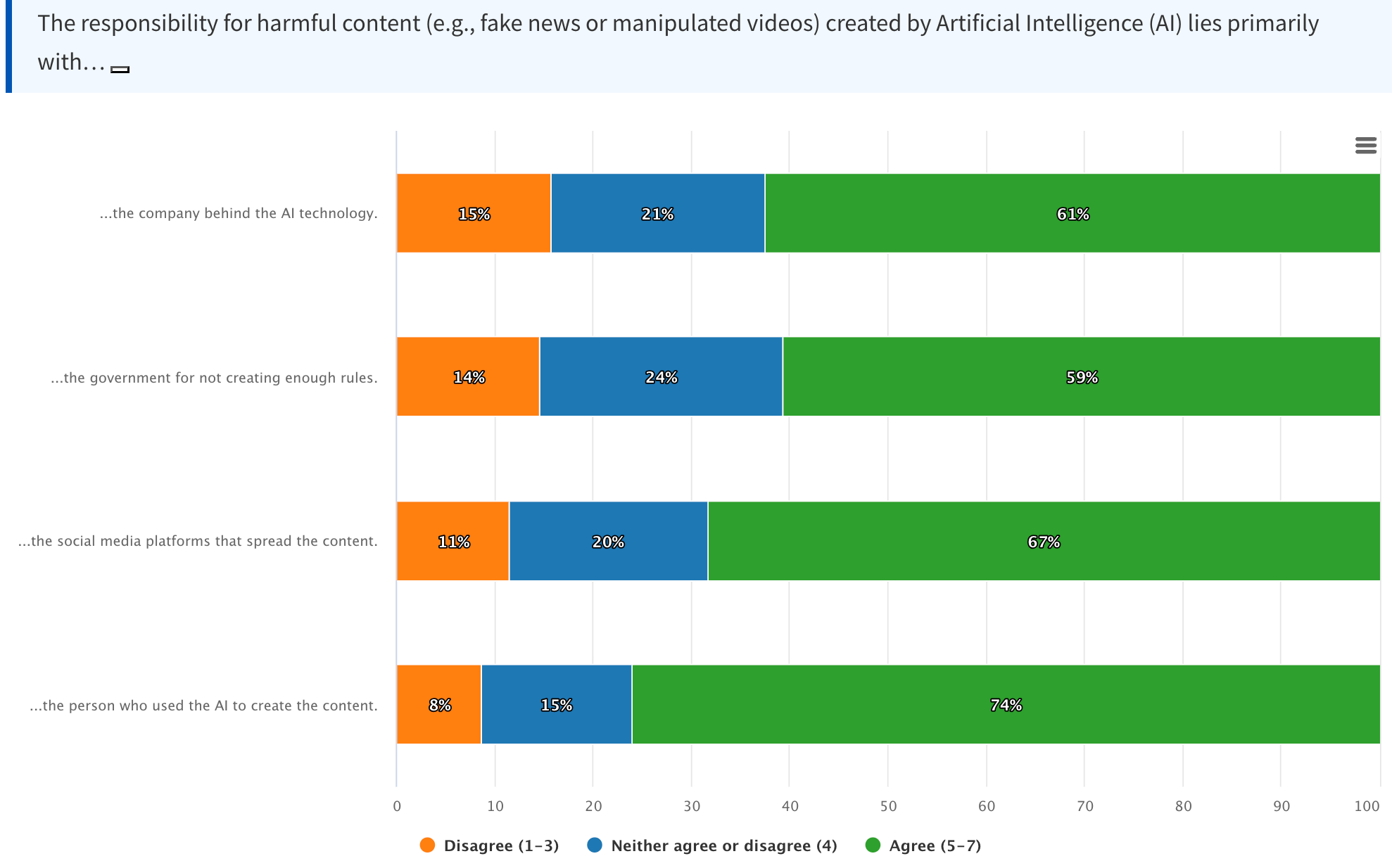 And when it comes to accountability (Figure 4), most Dutch citizens point the finger at those who create the content: 74% believe the individual who made the AI-generated material should be held responsible. Still, 67% also blame social media platforms for allowing such content to spread, and 59% say the government bears some responsibility for not preventing or regulating it.