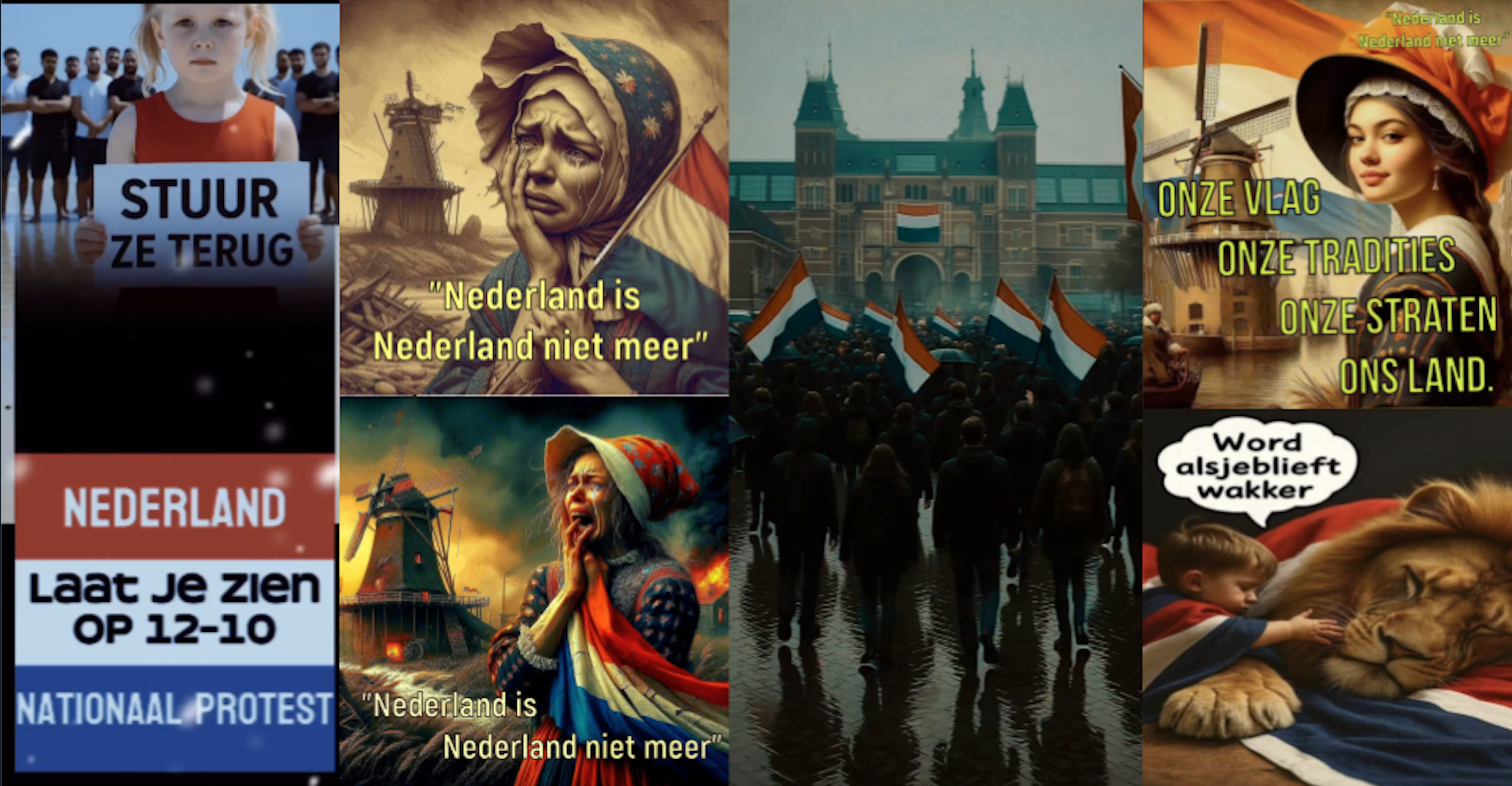 Our CampAIgn Tracker shows how far-right actors are increasingly employing generative Artificial Intelligence (A.I.) imagery as a tool for political mobilisation in order to persuade as many people as possible to join the far-right anti-immigration protests in The Hague and Amsterdam. These fake images tend to blend themes of nostalgia and an idyllic past with dystopia. The dystopian future theme often leans on ideas of an immigrant ‘invasion’ and is engulfed with anti-immigrant rhetoric. This theme is deployed to rile up feelings of anger and fear, specifically following the murder of Lisa in Abcoude where the suspect is believed to be an asylum seeker.